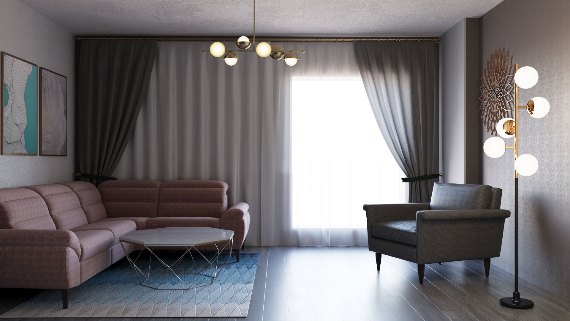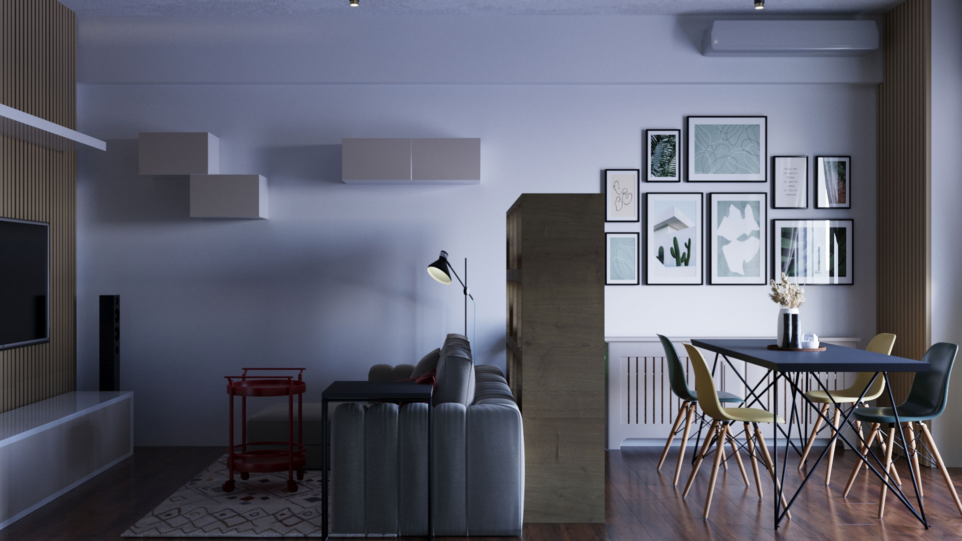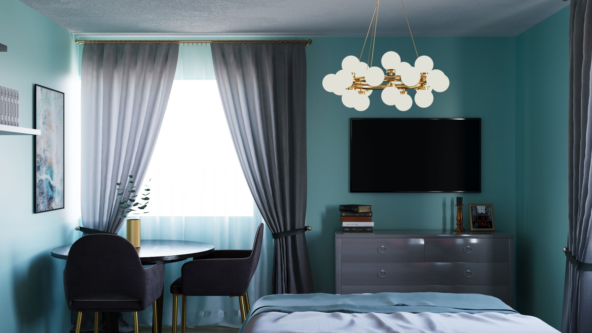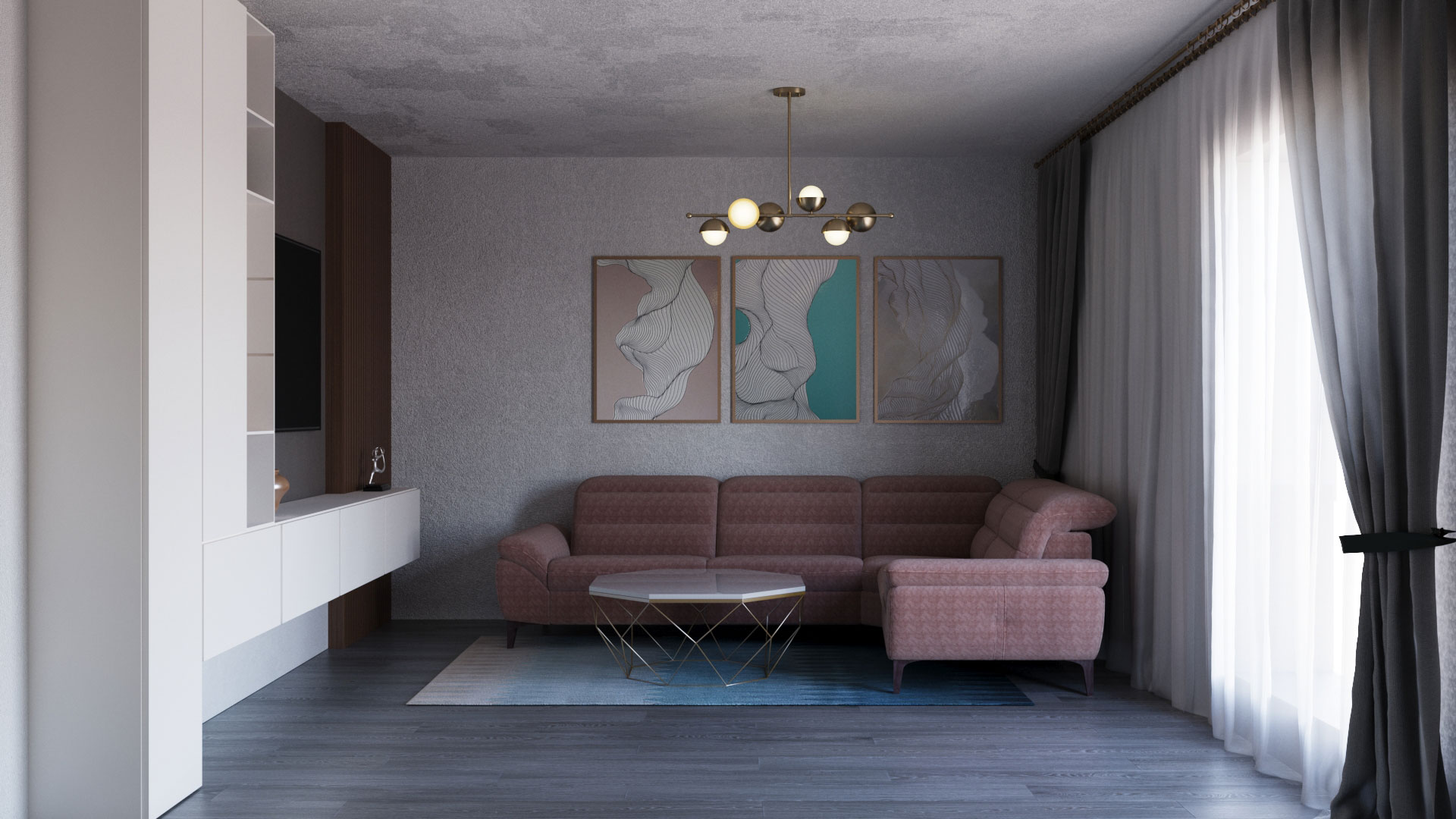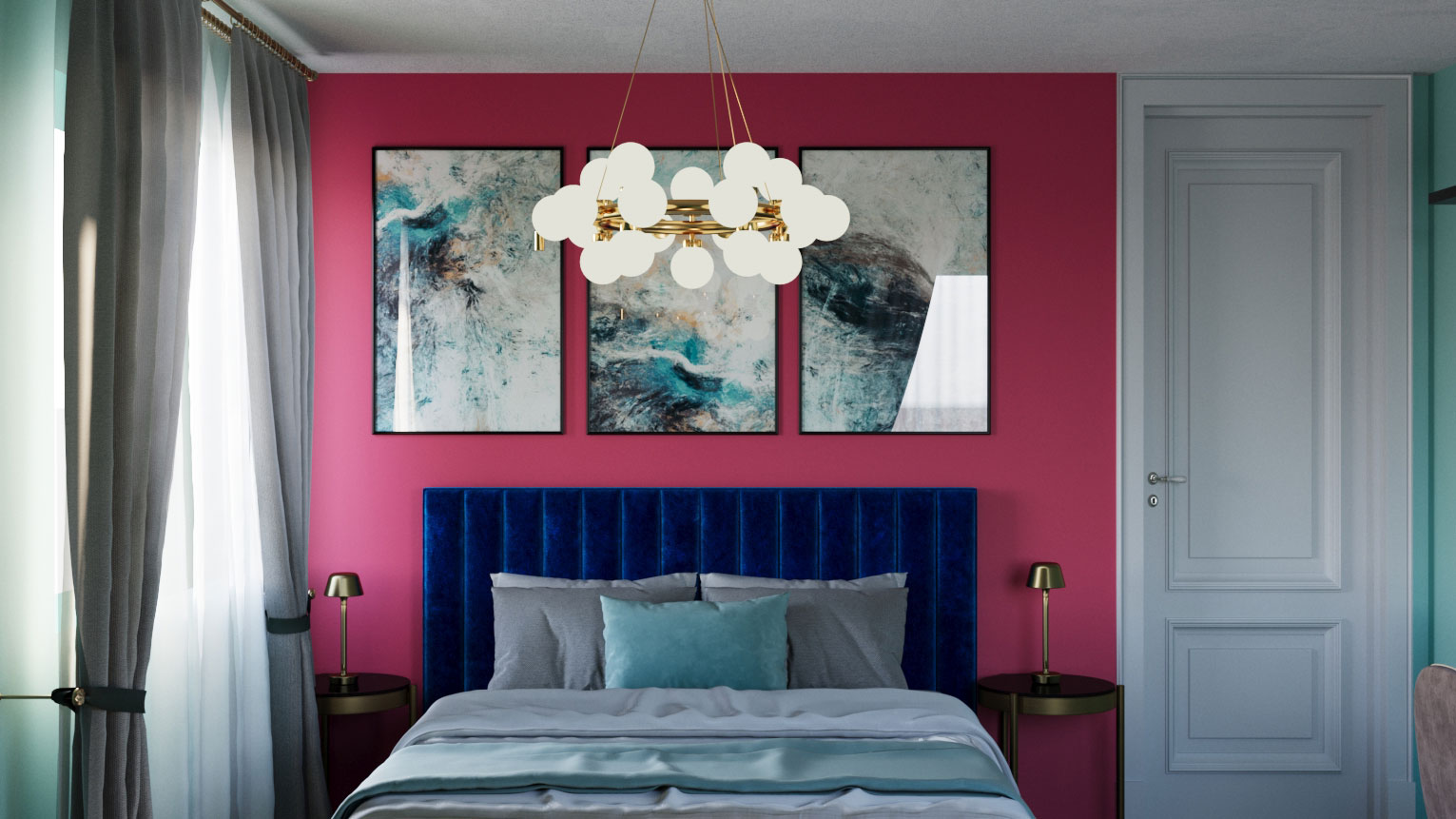 Compozitia cromatica este construita in jurul unor nuante intense, puse in echilibru de finisaje elegante si linii clare. Tonurile de turcoaz si roz sunt completate de accente de albastru profund si detalii aurii, care adauga ritm si personalitate intregului spatiu. Mobilierul, decorul si corpurile de iluminat contribuie la o amenajare coerenta, confortabila si bine pusa in valoare.