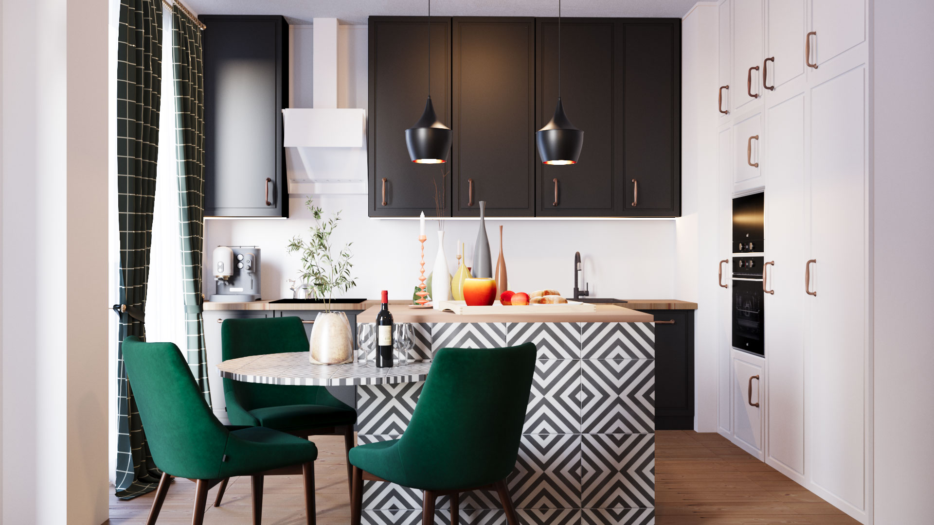 Proiectul pune accent pe echilibru vizual, functionalitate si o atmosfera usor de locuit. Bucataria moderna, cu fronturi verzi si accente din lemn, se completeaza firesc cu zona de zi amenajata in tonuri calde. Canapeaua in nuanta roz pudrat si detaliile decorative aduc personalitate, iar lumina naturala si texturile bine alese contureaza un spatiu relaxat si coerent.