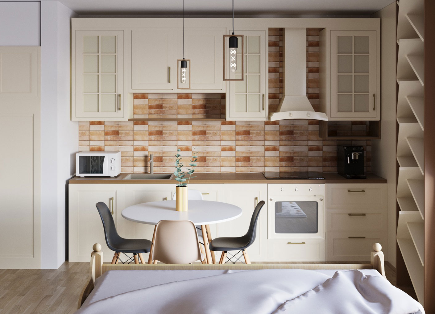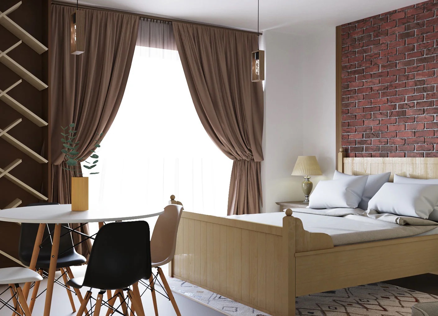 Amenajarea urmareste un echilibru clar intre functionalitate si estetica moderna, conturand un spatiu unitar si primitor atat in dormitor, cat si in zona de zi. Dormitorul este definit de tonuri calde de lemn, linii simple si detalii discrete, care sustin o atmosfera calma si ordonata. Zona de living open-space completeaza ansamblul prin texturi naturale, mobilier contemporan si un loc de dining integrat firesc, gandit pentru confort si socializare.